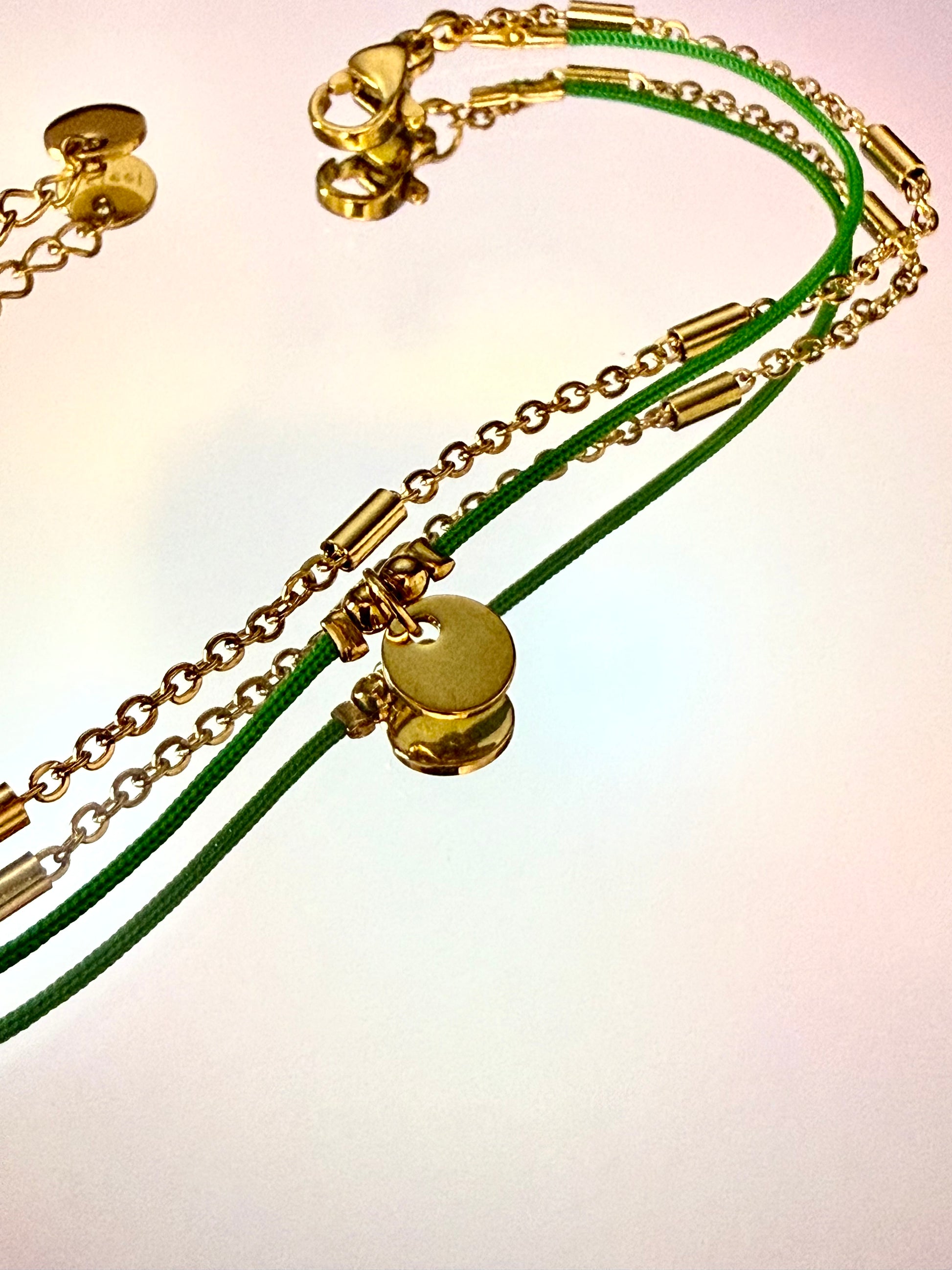 Pulsera en acero inoxidable dorada doblada con hilo verde